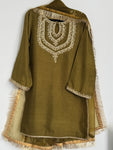 A luxurious ensamble crafted from korean raw silk, paired with a soft organza duppata to complete the look. This timeless masterpiece consist of a mixture of zarodozi, sequins, cut-dana and many other components.