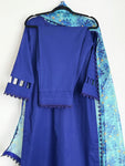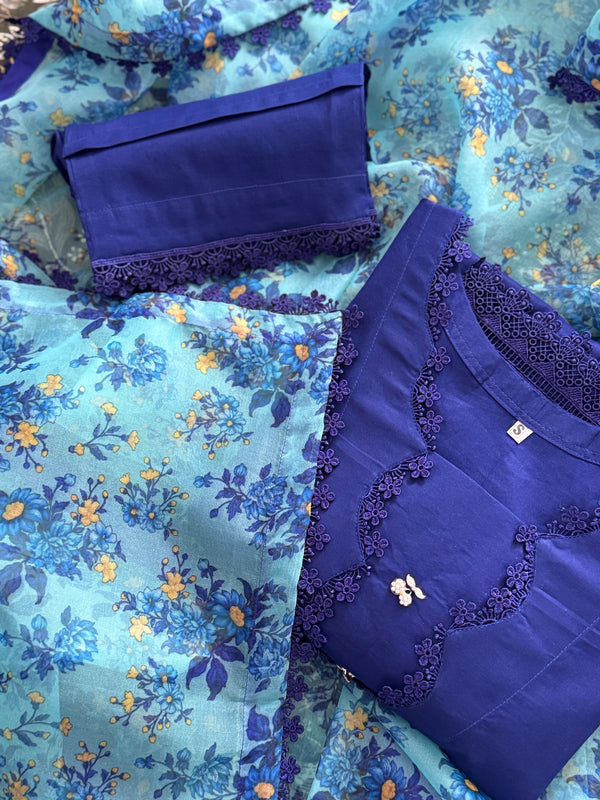 Solid lawn kameez and trouser paired with printed organza duppata (3 piece). Style details include: