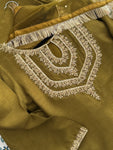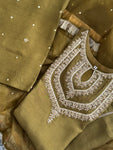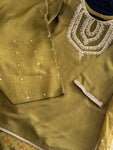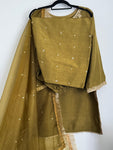 A luxurious ensamble crafted from korean raw silk, paired with a soft organza duppata to complete the look. This timeless masterpiece consist of a mixture of zarodozi, sequins, cut-dana and many other components.