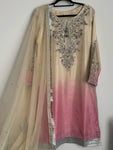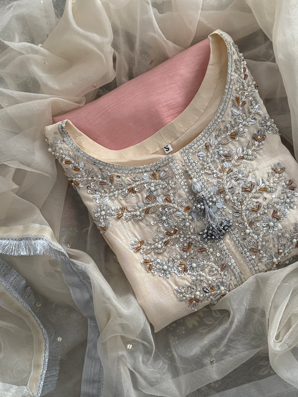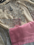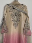 A stunning two-toned ensemble crafted from pure Korean raw silk. The intricate detailing is entirely handcrafted using a variety of embellishments. The outfit is paired with an organza dupatta adorned...